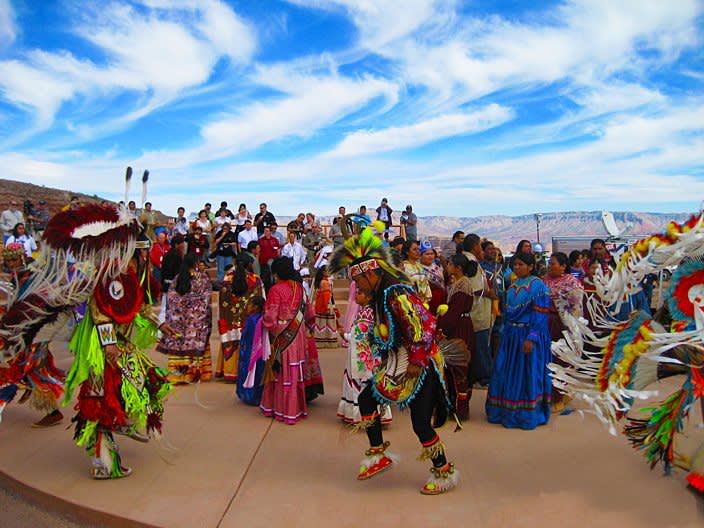 After leaving the Canyon, you will land at Grand Canyon West, where you will be met by your private VIP Hualapai Indian Ambassador Guide, for a true Hualapai Grand Canyon experience. Your private Hualapai Guide will take you to the viewing points at Grand Canyon West, while sharing the history and culture of the Hualapai, People of the Tall Pines. Tour the Native American Village, and learn about the dwellings and traditions of multiple tribes such as the Navejo, Hope and Havasupai, and take in the live Native American performances.